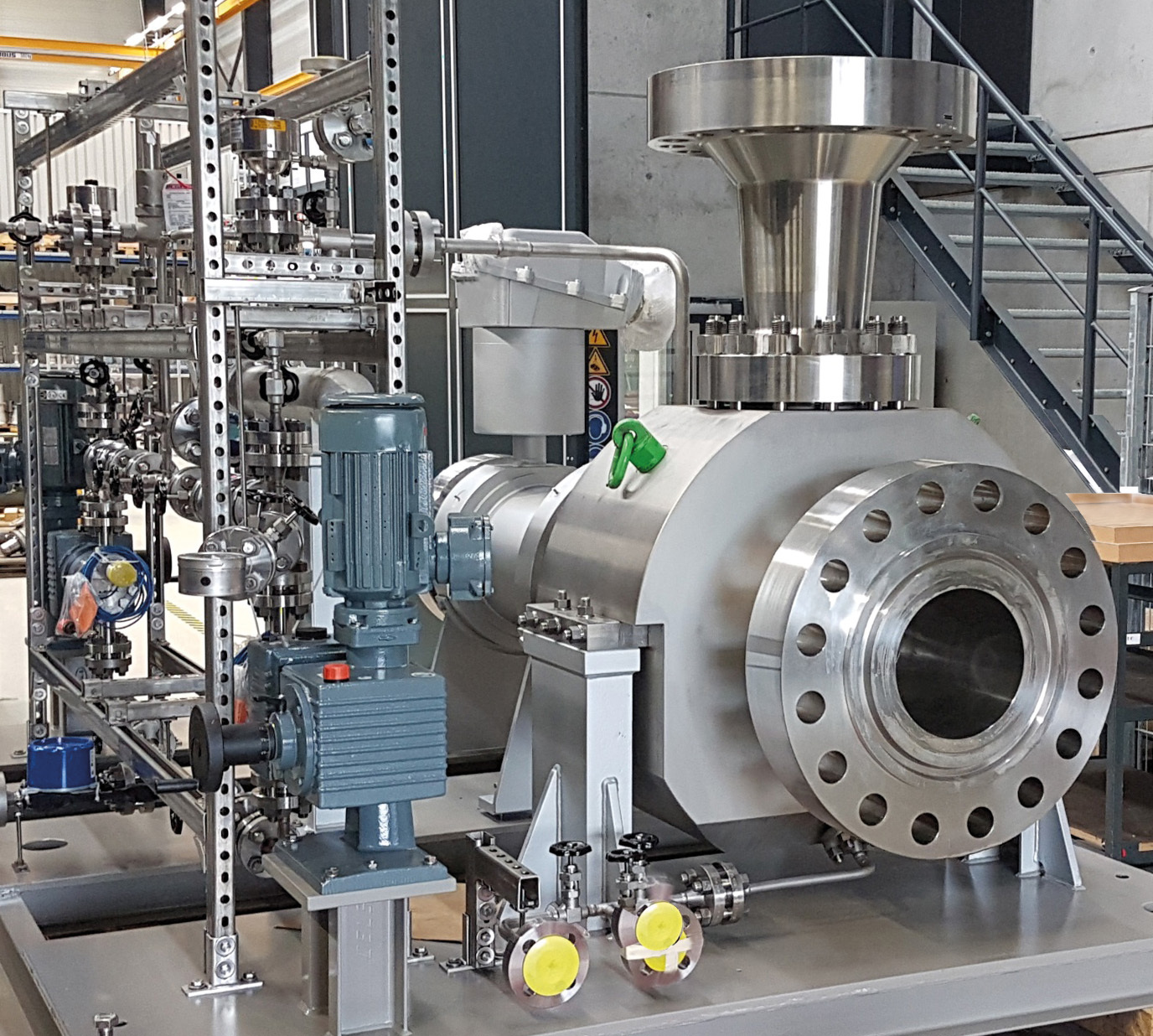 Het hart van het 10-ton zware pompsysteem is een hogedruk-busmotorpomp, van het type CNKfH+D 300-500. De watergekoelde motor van de pomp volgens API 685 heeft een asvermogen van 185 kW. Alle drukdragende delen zijn gemaakt van massief gesmeed materiaal. Het pomphuis is gemaakt van zeer duurzaam SS 316 Ti roestvrij staal en is getest tot 310 bar. Met een systeemdruk van 112 bar en een bedrijfstemperatuur van 405 graden Celsius is de geïntegreerde, compacte unit ontworpen voor een nominale druk van 130 bar. Naast de statorbus dient het motorhuis als tweede omhulling, wat zorgt voor een lekvrije, veilige pompoplossing.